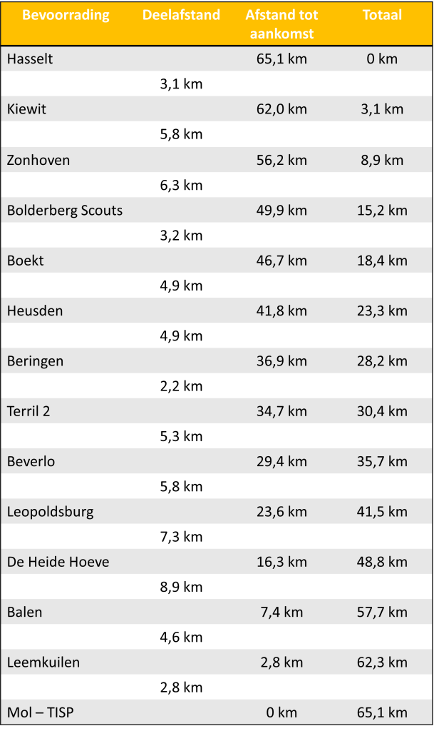Tijdens de wandeling bieden we regelmatig een bevoorrading aan. Het aanbod is variërend tussen alle bevoorradingen.